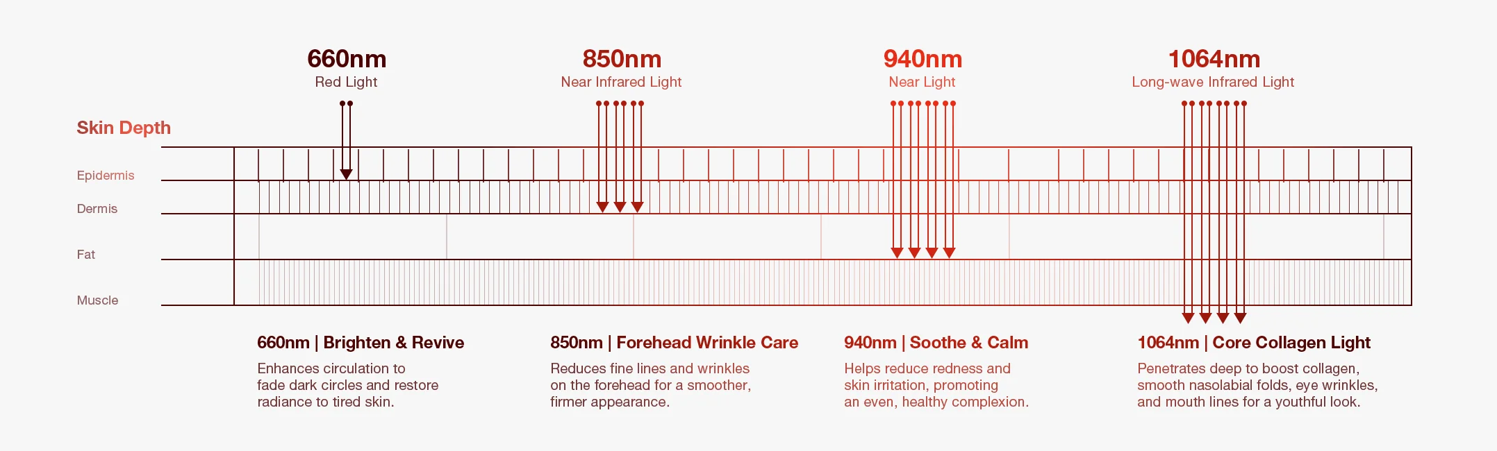 1: Red light 660nm - can enhance the skin's metabolism and improve dullness. 2: Near-infrared light 850nm - can enhance cell activity and make the skin elastic. 3: NIR light 940nm - activates the microcirculation of the skin, inhibits melanin, and improves skin rejuvenation. 4: Long-wave infrared light 1064nm--Promotes collagen regeneration in deep tissues and slows down skin aging rate.